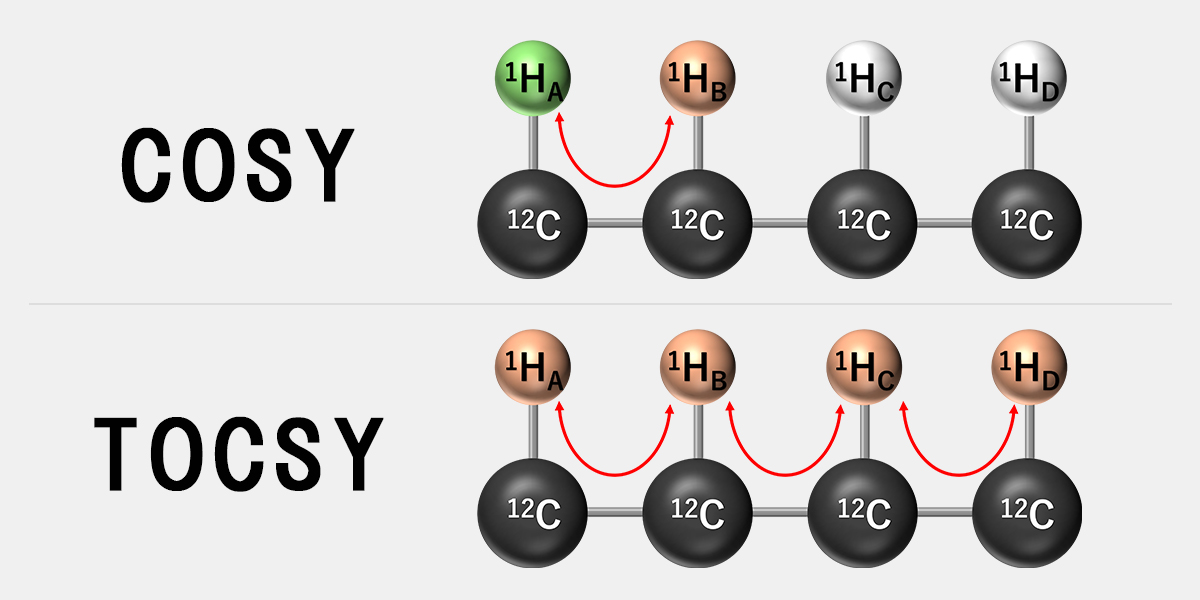 In this column, we explain the basic principles and analysis methods of COSY and TOCSY, which are representative techniques of 2D NMR. Starting from confirming correlations between adjacent protons using COSY, we introduce spin network analysis with TOCSY and analysis of carbohydrate using 1D and 2D TOCSY, with concrete examples.
