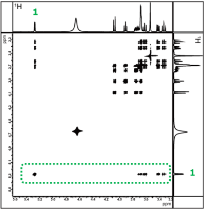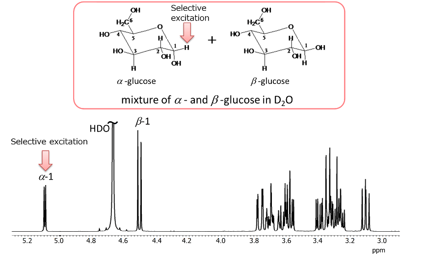 Glucose exists in aqueous solution as α- and β-anomers. Therefore, the 1H NMR spectrum is a mixed spectrum of α-glucose and β-glucose, as shown in Figure 13. For selective excitation of a 1H signal, it is typically to choose 1H appearing at a lower field than others(in the case of sugars, 1H at the anomeric position). The result of a 1D TOCSY experiment by selectively exciting the anomeric 1H at position 1 of α-glucose is shown in Figure 14.