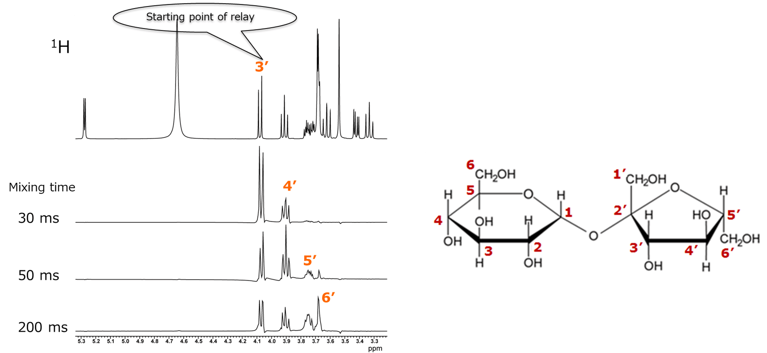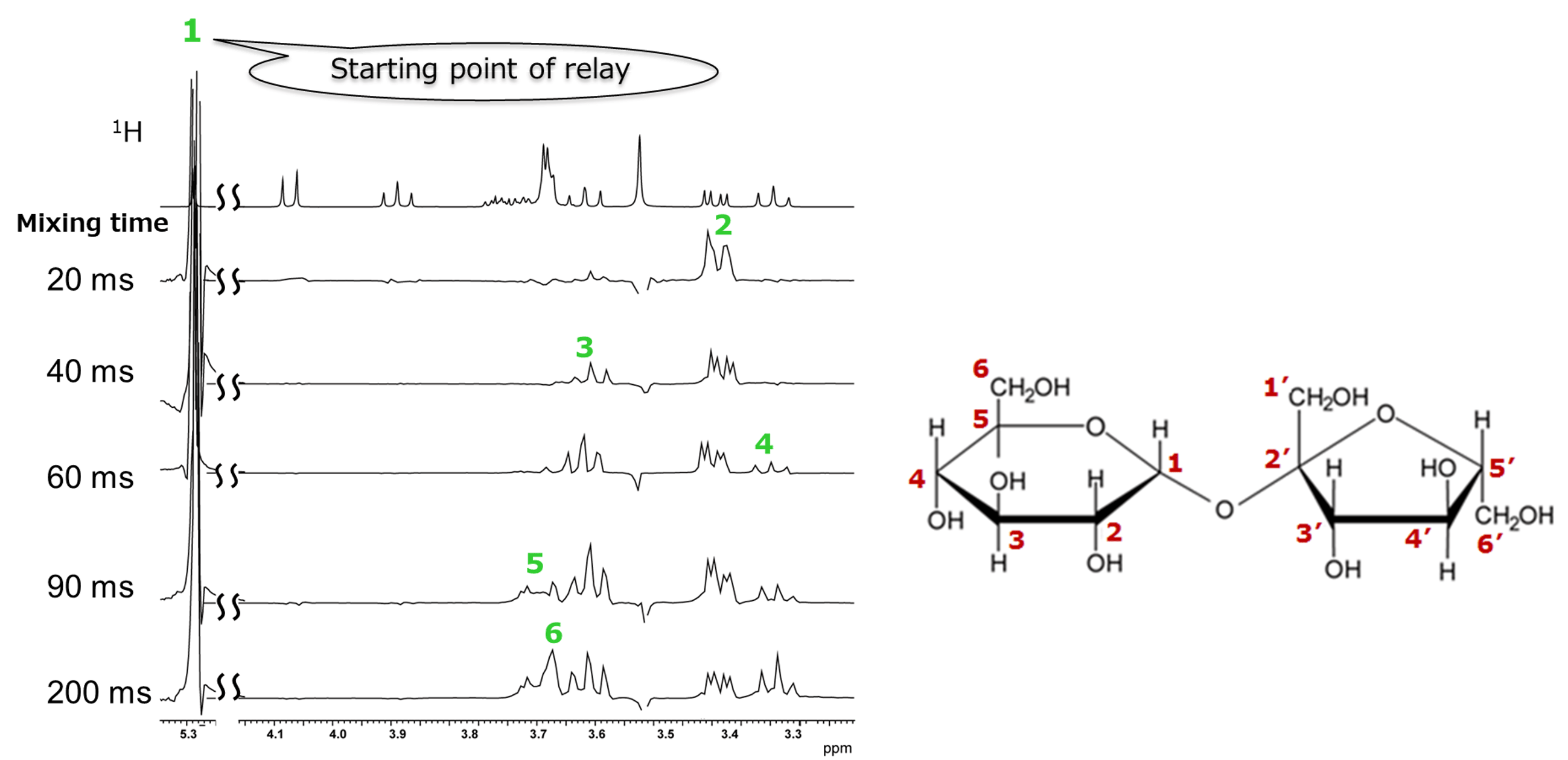 As before, we take the Fru H-3′ as the starting point of the relay. As the mixing time increases, correlations with the Fru H-4′, Fru H-5′, and Fru H-6′ appear, allowing us to confirm the connections within the fructose moiety.