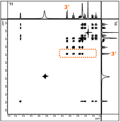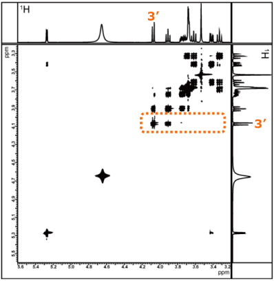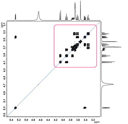 Let us show you the COSY spectrum of sucrose in Fig. 7. The part highlighted in the red frame is enlarged and shown in Fig. 8.