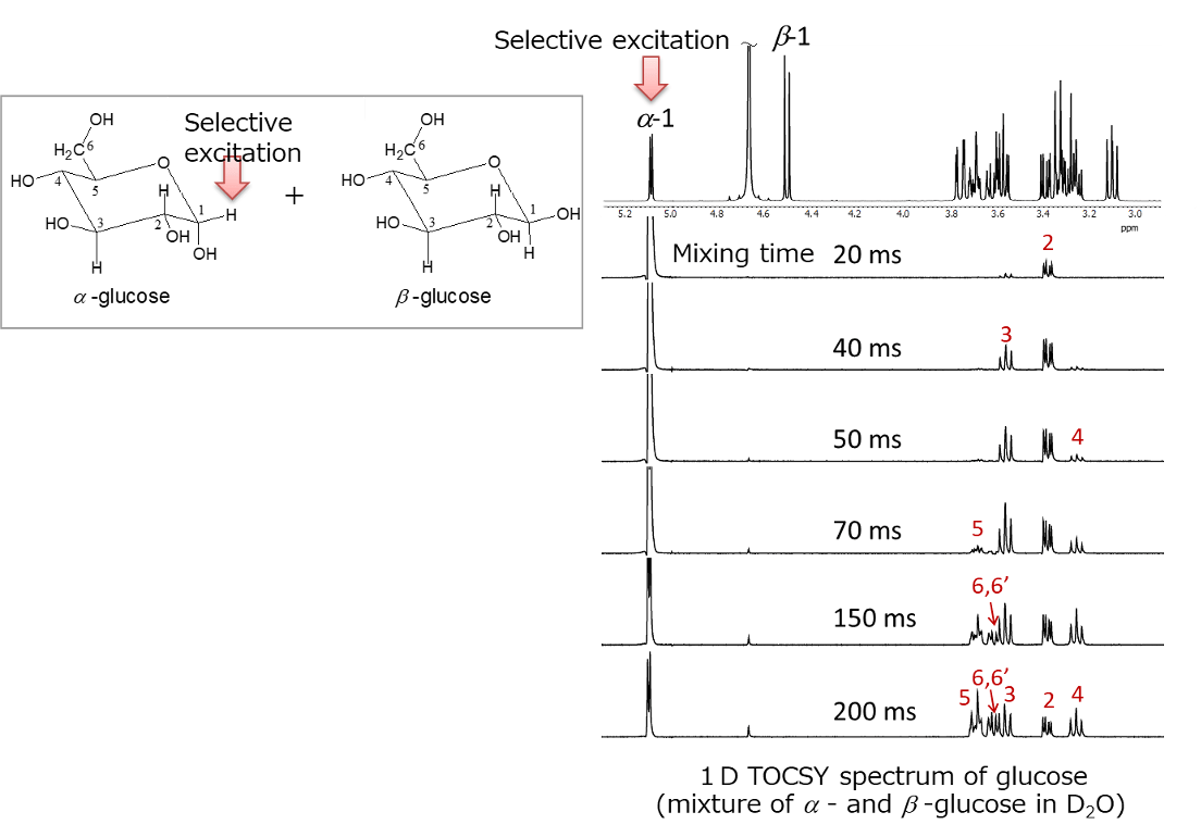 By varying the mixing time from 20 ms to 200 ms, it was possible to trace the spin network starting from the anomeric 1H at position 1 of α-glucose as the relay point. The bottom spectrum with a mixing time of 200 ms represents the extraction of only the spin network of α-glucose from the mixed spectrum of α-glucose and β-glucose. Furthermore, as explained earlier, 1D TOCSY provides better digital resolution than 2D sliced data.