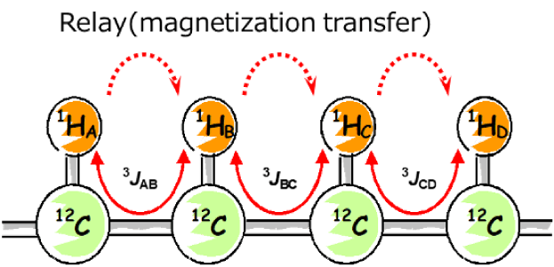 For example, suppose that there are atomic connections as shown in Figure 3. HA・HB・HC・HD are connected through spin couplings between neighboring 1Hs, and this connection is called spin system (spin network). The spin system does not propagate through quaternary carbons without attached H or 1H coupled via oxygen, so the network is interrupted at these points. TOCSY allows us to observe correlations between nuclei within the same spin system even if they are not directly coupled--for instance, between 1HA and 1HD. In TOCSY, the magnetization is transferred step by step: from HA to HB, then from HB to HC, and finally from HC to HD. In other words, magnetization moves through the spin system, connecting everything along the way. This magnetization transfer is called "relay". TOCSY observes the correlation signals based on this relay.