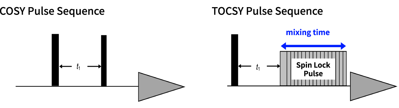 Fig. 4 shows the pulse sequences for COSY and TOCSY. COSY uses two 90°pulses, while with the TOCSY, the second pulse is a spin lock pulse. The duration of this spin lock pulse is called "mixing time" , which is a key parameter with TOCSY. By increasing the mixing time, you can observe correlation signals that have been relayed over longer distances within the spin system.