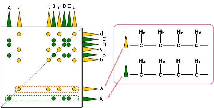 Fig. 5 shows a schematic diagram of a TOCSY spectrum of a compound having two independent spin networks. Each spin network is expressed in yellow and in green. As shown, TOCSY observes correlation of all 1Hs belonging to each spin network. At that time, if signals like "A" and "a" within the primary spectrum on both axes appear away from the region where signals appear densely, the signals are easily classified separately in the networks of yellow and green, enabling confirmation of each spin network.