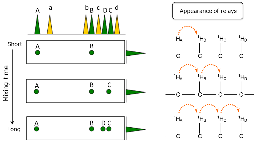 When the mixing time is further increased, the magnetization moves to 1HC, and correlation signal C appears. When the mixing time is increased even more, the magnetization moves to 1HD, and correlation signal D appeared. As a result, it becomes clear that there is a connection of 1HA - 1HB - 1HC - 1HD.