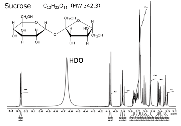 Here, we present an example of analysis for sucrose using 2D TOCSY. Sucrose is a disaccharide composed of glucose and fructose linked by a glycosidic bond. Sucrose contains a total of 22 1Hs, but since the sample is dissolved in heavy water, the 1Hs of the hydroxyl groups (-OH) are not observed due to deuterium exchange. Therefore, in this case, 14 1Hs are observed, excluding the 8 1Hs of hydroxyl group.