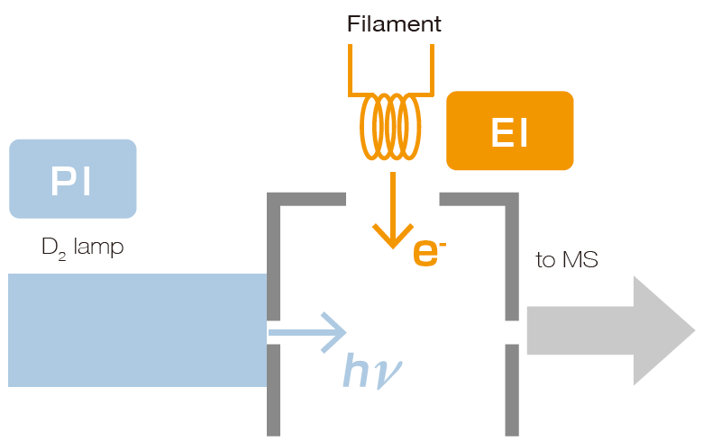 Photoionization (PI) is a soft ionization method that uses a vacuum ultraviolet (VUV) lamp. The EI/PI combination ion source allows both EI (Hard ionization) and PI (Soft ionization) without removing the ion source. All that is required for switching between EI and PI is to turn OFF the EI filament and turn ON the PI lamp or vice versa.