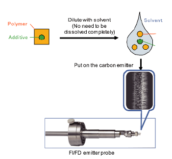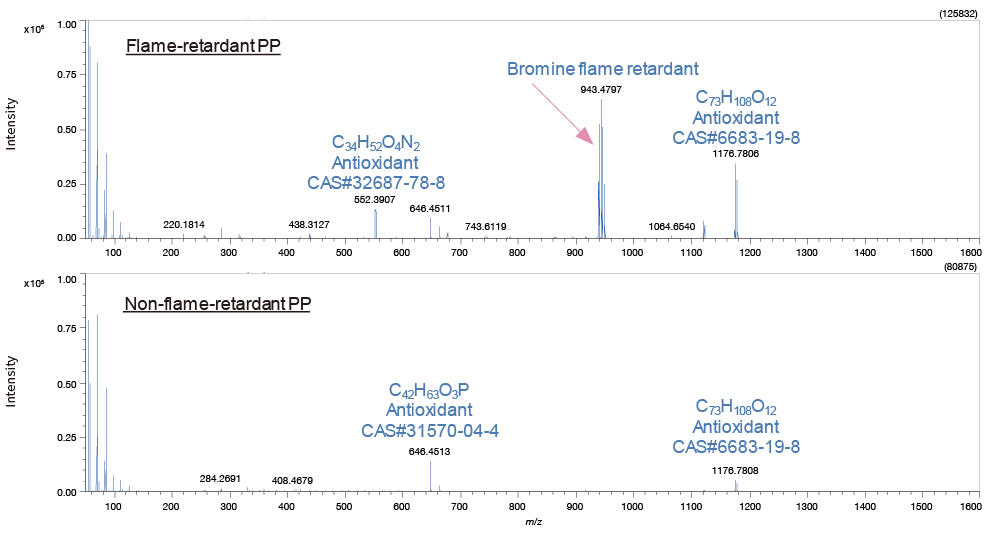 In the FD method, the sample is dissolved or dispersed with a solvent and then applied onto the emitter to be introduced into the ion source. The sample does not need to be completely dissolved in the solvent. In this case, it is possible to analyze only the additives in the solvent. Since it is a direct sample injection method without using a column, high boiling point (high mass) components can be measured. Since it is soft ionization, molecular ions can be detected. A clear difference peak was detected at m/z 943.4797 from the flame-retardant PP. It was estimated to be a brominated flame retardant by isotope pattern analysis and composition estimation.