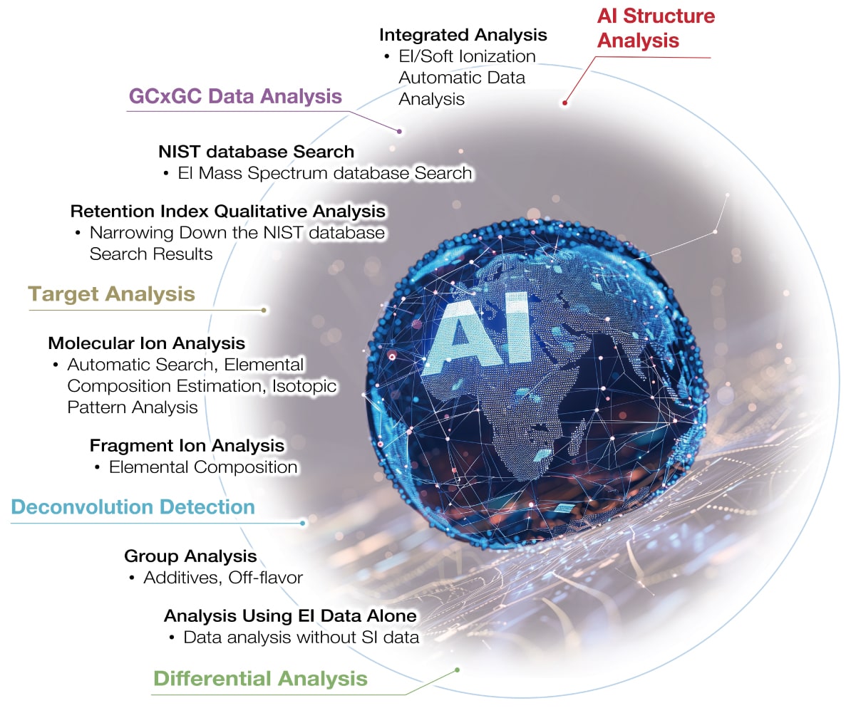 The msFineAnalysis AI utilizes four different AI models to automatically perform analyses on molecular formulas, substructures, and technical know-how, and provides analytical results quickly.