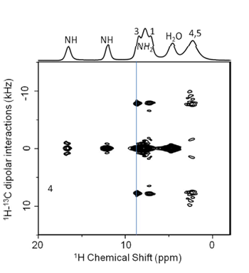 Fig.4 2D CP-VC H-N-H spectrum of 15N-natural abundance L-histidine∙HCl∙H2O recorded at 70 kHz MAS. The 1H MAS spectrum is shown on top.