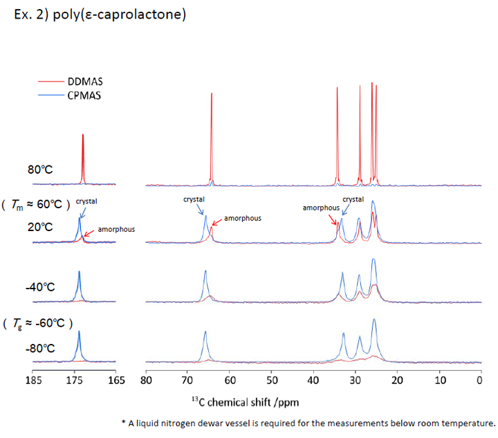 Below Tg, signals are observed only in the CPMAS spectrum because both crystalline and amorphous regions have low molecular mobility. Above Tg, rubber state amorphous signals appeared in the DDMAS spectra. Above Tm , very narrow molten state signals are observed in the DDMAS spectrum while any signals are absent in the CPMAS spectrum.