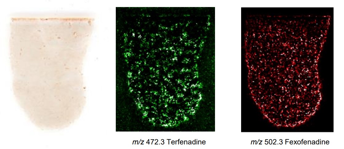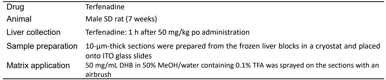 The MS Imaging measurements on the liver tissue section (7.8 mmx9.2 mm) were performed on the SpiralTOF in positive ion mode with a spatial resolution of 50 µm. The MS Imaging data was processed with msMicroImager (JEOL). The MS/MS measurements with TOF-TOF positive ion mode were also performed for structure analysis of the drug and its metabolite.