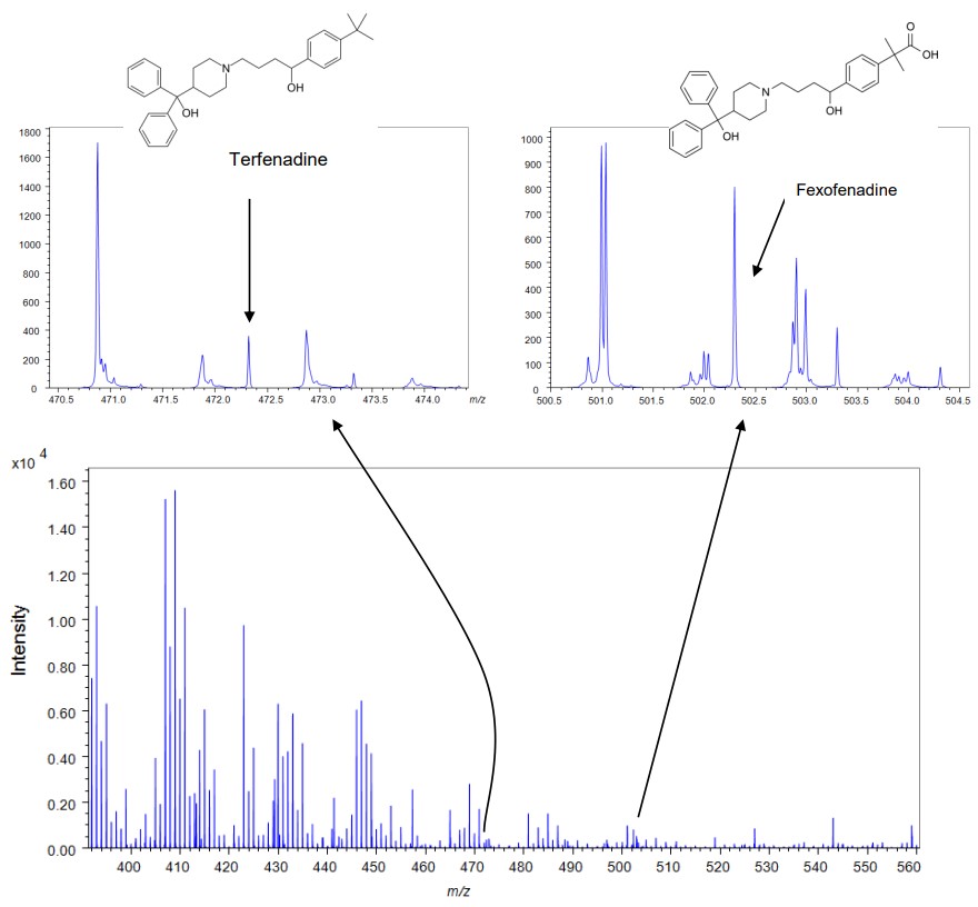 The peak observed at m/z 472.3425 in the averaged mass spectrum was assigned to terfenadine (C32H41NO2) [M+H]+ (m/z 472.3210) and was supported by the MS/MS measurements (described below). The averaged mass spectrum, which was mass corrected using the assigned peak of terfenadine, is shown in Fig. 1. The enlarged mass spectrum at m/z 472 and 502 are also shown. The peak at m/z 502.2944 was assigned to fexofenadine (C32H39NO4) [M+H]+ (m/z 502.2952), a metabolite of terfenadine, by accurate mass and MS/MS measurements (also described below). The isobaric separation capability of 0.2-0.3 u was then used to draw the inherent mass images for each target peak. The optical image of the tissue section and the mass images for m/z 472.3 and m/z 502.3 with 0.1u mass window are shown in Fig.2. Both terfenadine and fexofendine were distributed across the liver tissue sections.