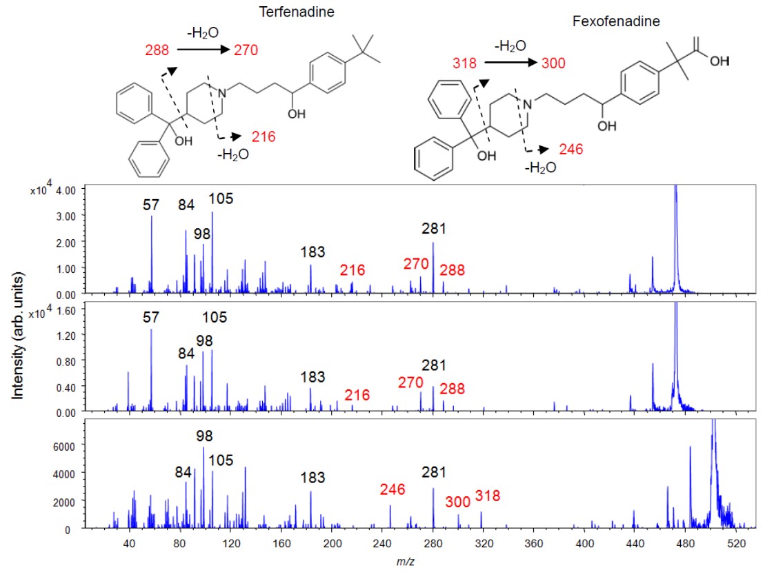 The product ion spectrum of a) terfenadine spotted on ITO glass, b) m/z 472.3 and c) m/z 502.2 from the liver tissue section are shown in Fig. 3. The fragmentation channels observed in Fig. 3a and b were nearly identical so that m/z 472.3 was assigned to terfenadine. The estimated fragmentation paths observed at m/z 216, 270 and 288 are shown in the structural formula for terfenadine. Most of the fragments observed in Fig. 3c were similar to Fig 3a, but several of them were observed to have a 30 u difference (red numbers). These differences were likely due to the methyl group in terfenadine changing to a carboxyl group in fexofendine.