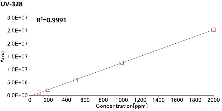 SIM chromatograms of DP and UV-328 at concentration of 100 ppm in ABS were shown in Figure 1, Calibration curves of each compound draw by measuring pseudo-standard samples at concentration of 100, 200, 500, 1000, 2000 ppm in ABS were shown Figure 2. Incidentally, the area of 2 isomer peaks (syn-DP, anti-DP) were totaled. About linearity of calibration curves, good results were obtained, with coefficient of determination was more than 0.999.