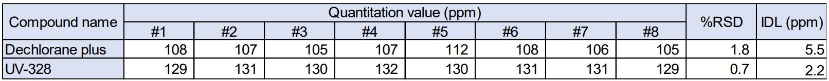 The relative standard deviation (%RSD) of quantitative values obtained by measuring sample in number of trials n=8 at concentration of lower limit in resin (100 ppm) and the calculated IDL were shown in Table 2. At each compound, good results were obtained, with %RSD was less than 5% and IDL was 10 ppm or less. Incidentally, IDL was calculated with t-value of t-test.