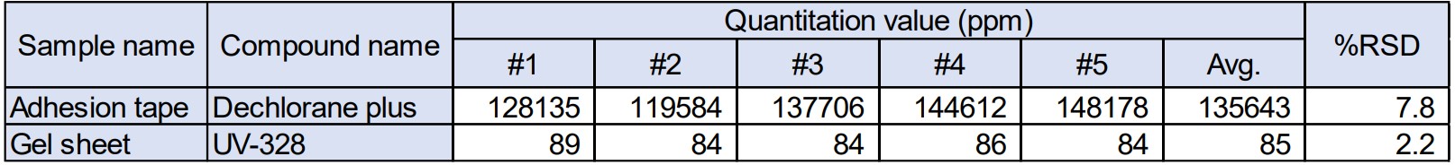 Actual samples were measured in number of trials n=5 respectively. SIM chromatogram of DP from Insulating sticky tape and UV-328 from Impact absorption gel sheet were shown in Figure 4. %RSD calculated by using calibration curve were shown in Table 4. %RSD was less than 10 % at over a wide concentration range of approximately 85~1.3×10^5 ppm, the result indicates that a screening analysis was adequate.