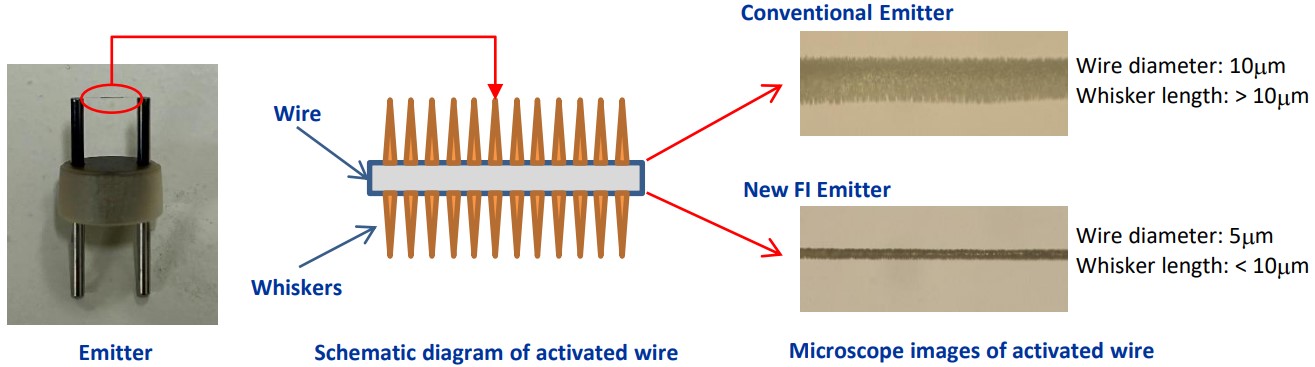 For the field ionization (FI) method, a gas sample is ionized as its electrons move to the emitter (tunneling effect) in a high electric field. This is one of the soft ionization methods in which fragmentation is unlikely to occur. Even if molecular ions cannot be detected from a sample by the electron ionization (EI) method, the FI method can detect molecular ions and obtain molecular mass information, making it an effective ionization method for qualitative analysis. The detection sensitivity of the FI method largely depends on the wire configured in the emitter and the form of the whiskers created on the wire surface. We have developed a new emitter with the wire and conditions for creating whiskers optimized for the FI method in order to improve detection sensitivity. The effectiveness of this emitter is reported below by comparison with conventional emitters.