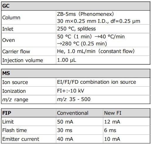 The tip of the emitter consists of a wire and an extremely large number of needle-shaped whiskers created on it. On the conventional emitter, the wire is 10 µm in diameter and the whiskers are several tens of µm in length. This is designed to make it easy to sustain the sample applied to the emitter in consideration of its use in the field desorption (FD) method. On the other hand, for the FI method, the sample is adsorbed on the emitter and chromatogram peak tails appear. If the flash baking current is raised to prevent them, the detection sensitivity is degraded. The newly developed emitter is designed to inhibit the sample adsorption by making the wire thinner with the diameter reduced to 5 µm and shortening the whisker length compared to that of conventional models. The test sample was prepared from n-Hexadecane (Sigma Aldrich product, #55209) to 100 pg/µL using hexane. Measurement was performed by the FI method using each emitter with the mass spectrometer GC-TOFMS (JMS-T2000GC AccuTOF™ GC-Alpha, JEOL product) and a combination ion source for EI, FI, and FD. Details of the measurement conditions are shown in Table 1.