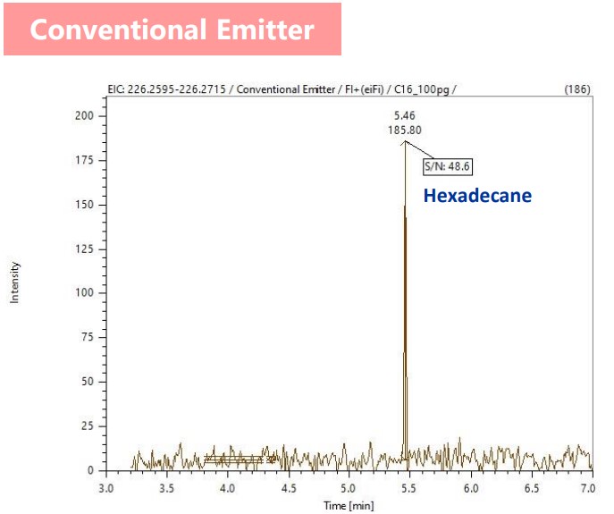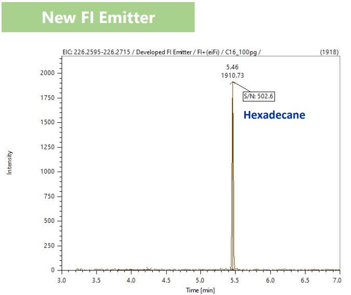 The results of FI measurement of hexadecane (C16H34, MW 226) at 100 pg using the conventional emitter and the newly developed FI emitter are shown below. Figure 1 shows the extracted ion chromatograms (EIC) of hexadecane molecular ions (m/z 226). Both the conventional emitter and the new FI emitter show the good peak shapes. The sensitivity improved by approximately 10 times from S/N 48.6 on the conventional emitter to S/N 502.6 on the new FI emitter. Possible factors are as follows: the wire of the FI emitter is made thinner with the diameter reduced by half compared with the conventional model, which has raised the electric field at the tip of the whiskers and made it possible to ionize more components of the sample. In addition, the shortening of the whiskers has reduced adsorption of sample components on the emitter, and the flash baking conditions are such that the amount of electricity per unit time is reduced to 5% of that of conventional emitters (current: 10 mA from 40 mA, time: 6 ms from 30 ms).