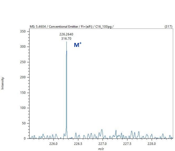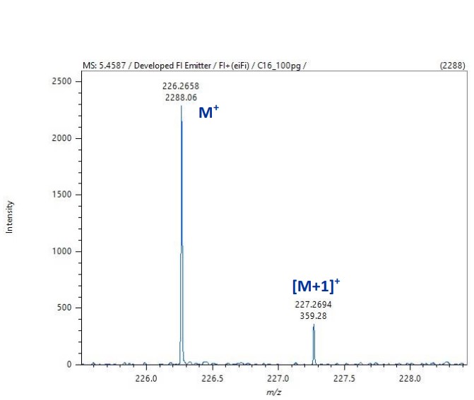 Figure 2 shows the mass spectra of hexadecane. Molecular ions (M+) were clearly observed both on the conventional emitter and on the FI emitter. However, on the conventional emitter, the isotopic ion ([M+1]+) that should be observed at m/z 227 was not observed. On the other hand, the ion ([M+1]+) was clearly observed on the FI emitter. In qualitative analysis, the detection sensitivity of molecular ions is important, but at the same time, highly sensitive detection of isotope ions makes it possible to narrow down the molecular composition through isotope matching. This allows highly accurate qualitative analysis to be performed.