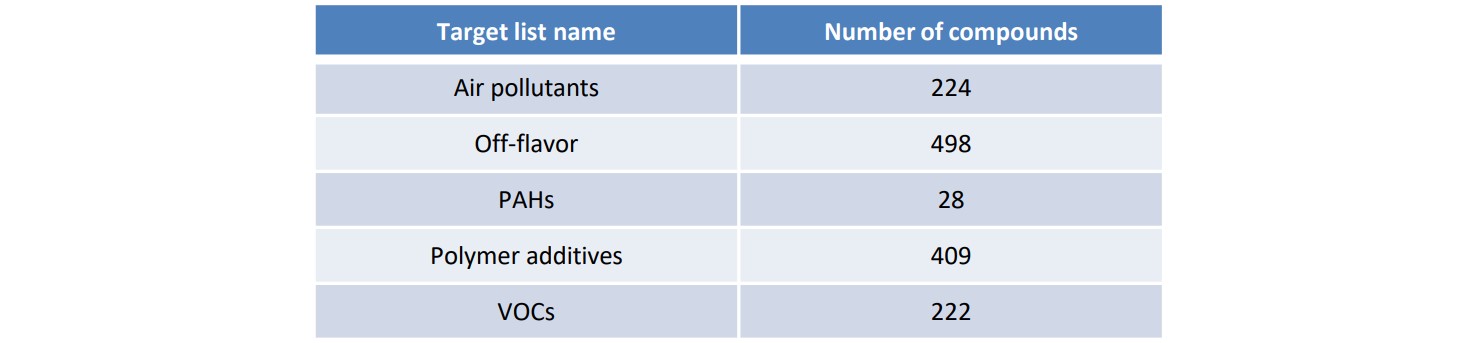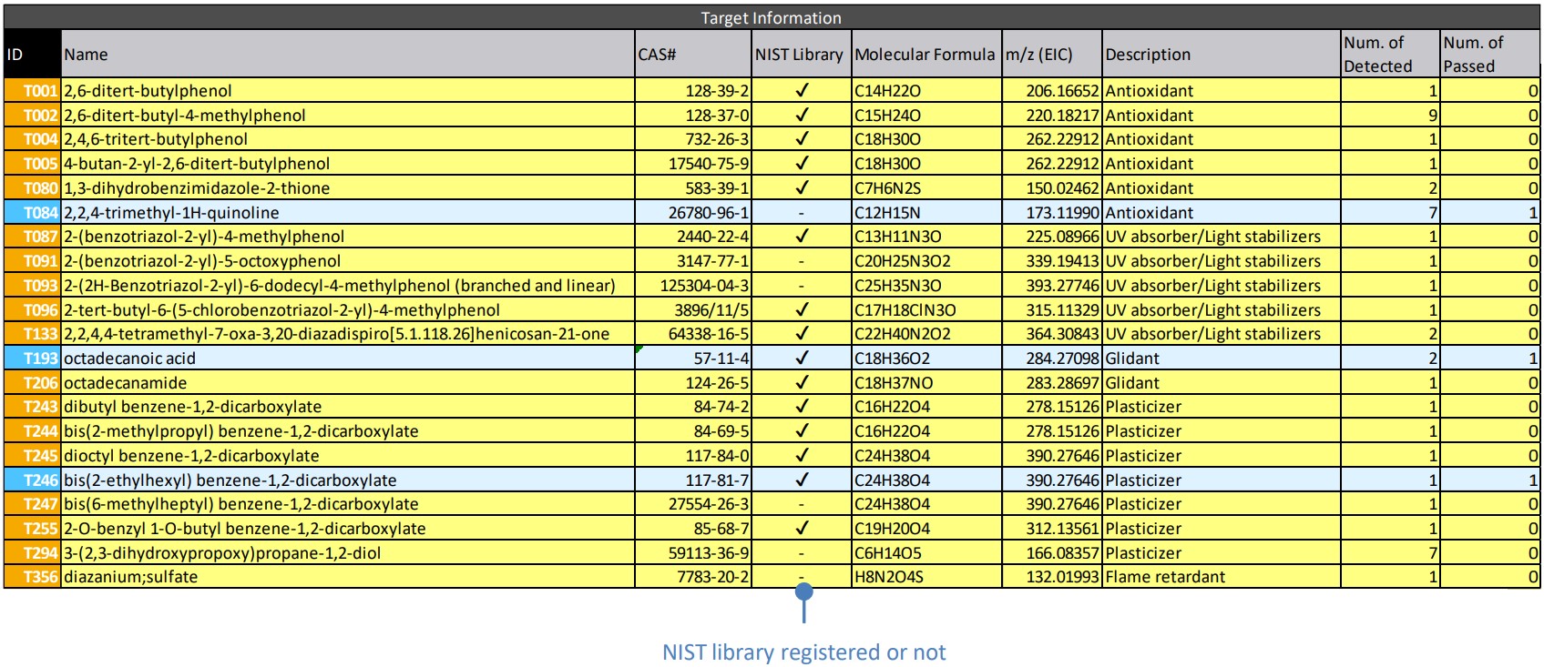 Table 1 shows the software preset target list and the number of compounds. In this MSTips, we will introduce an application using "Polymer additives".