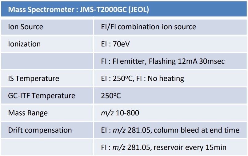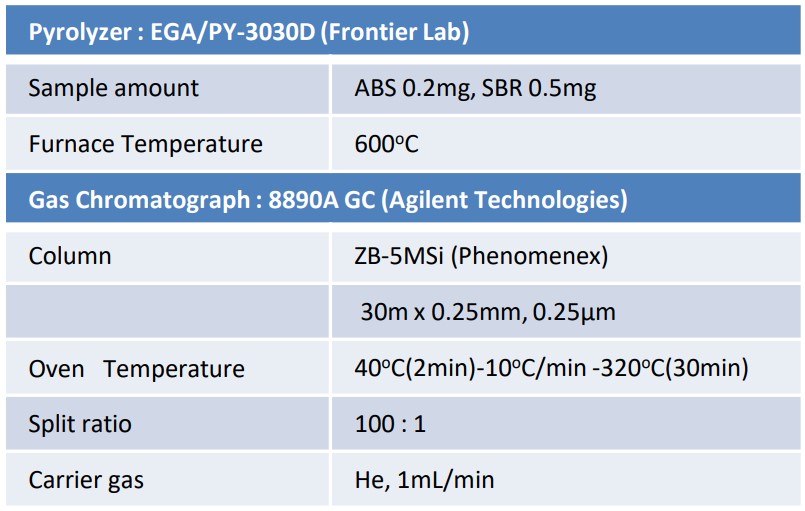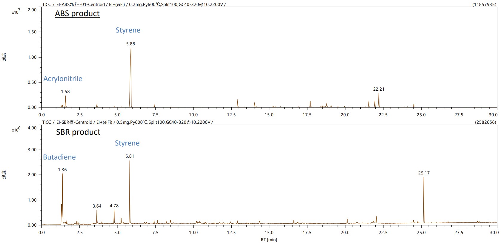 As the sample, commercially available acrylonitrile-butadiene-styrene (ABS) copolymer and styrene-butadiene rubber (SBR) products were used. 0.2 mg of ABS and 0.5 mg of SBR were weighed and measured using Pyrolysis-GC-MS. EI and FI (field ionization) methods were used for ionization. The obtained data were analyzed using msFineAnalysis AI. Table 2 shows details of the measurement conditions.
