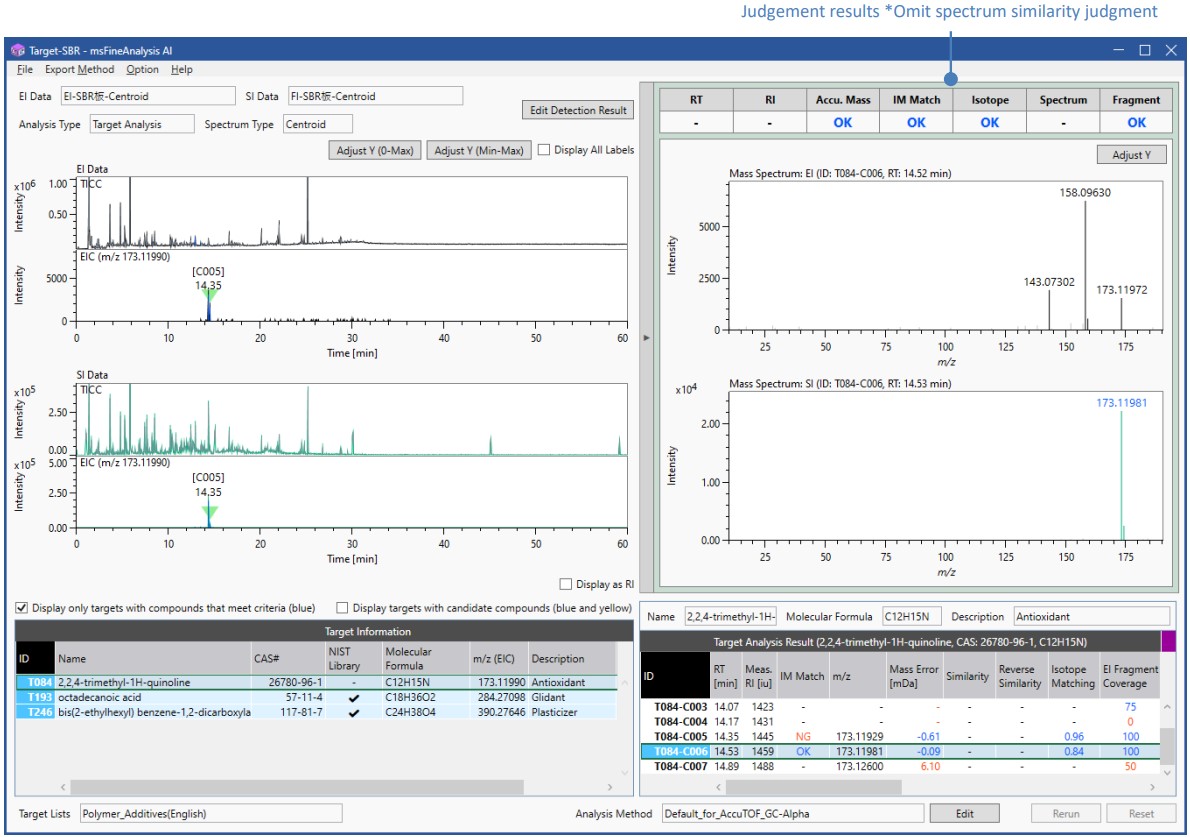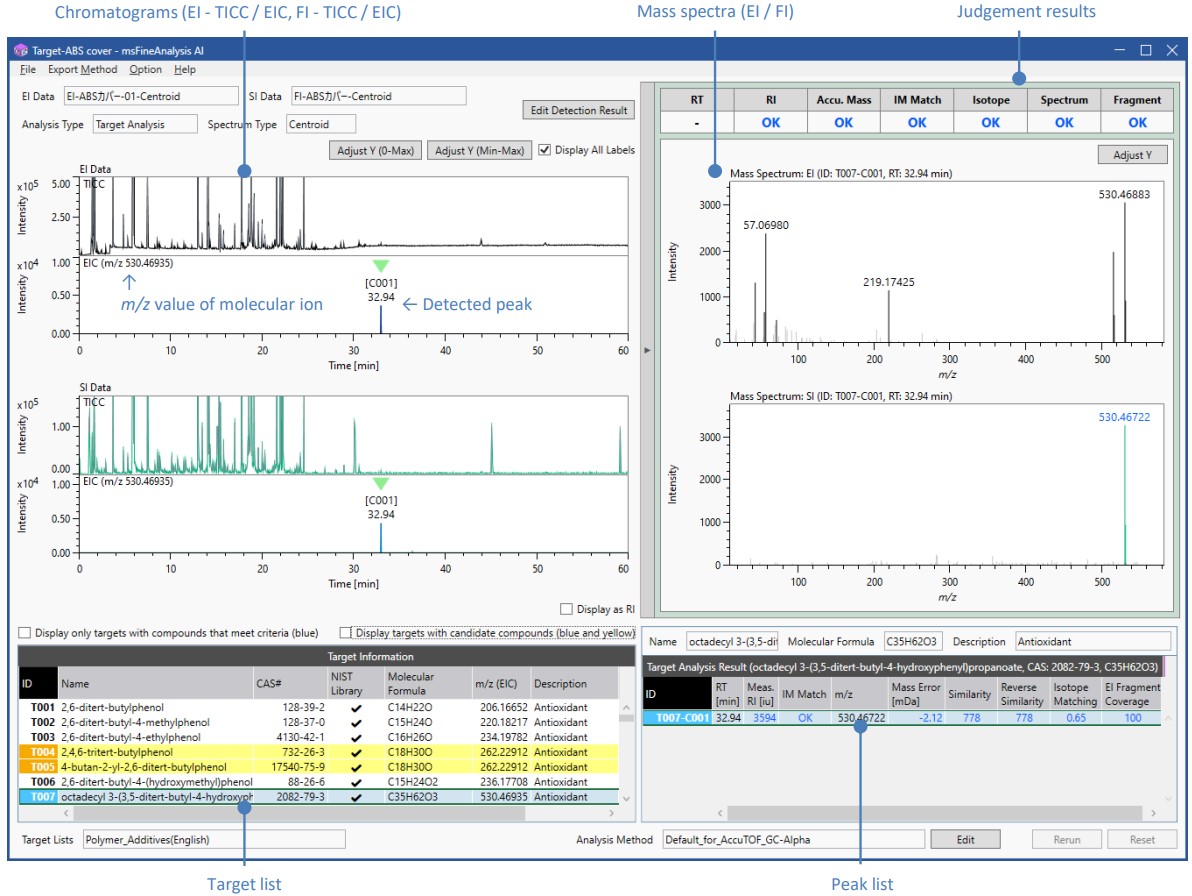 This function detects peaks from extracted ion chromatograms (EICs) based on information such as the molecular formulas and mass spectra of pre-listed compounds. Furthermore, the detected peaks are judged using retention time (RT), retention index (RI), accurate mass analysis of molecular ions and fragment ions, isotope patterns, and mass spectrum similarity. For compounds not registered in the NIST library, the accuracy of judgment can be improved by AI structural analysis.