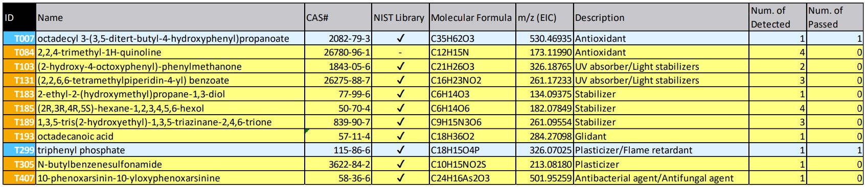 Table 3 shows the target list of the analysis results. The background color reflects the analysis results. Yellow indicates compounds with peaks detected on the EIC, and blue indicates compounds that also passed qualitative analysis such as mass spectrum similarity (=compound identified to be targets). In this result, two compounds were identified : octadecyl 3-(3,5-ditert-butyl-4-hydroxyphenyl)propanoate, an antioxidant, and triphenyl phosphate, a plasticizer / a flame retardant. These peaks were weak, with an intensity ratio of less than 1%, so they were difficult to identify in non-target analysis. But they were easily identified in targeted analysis.