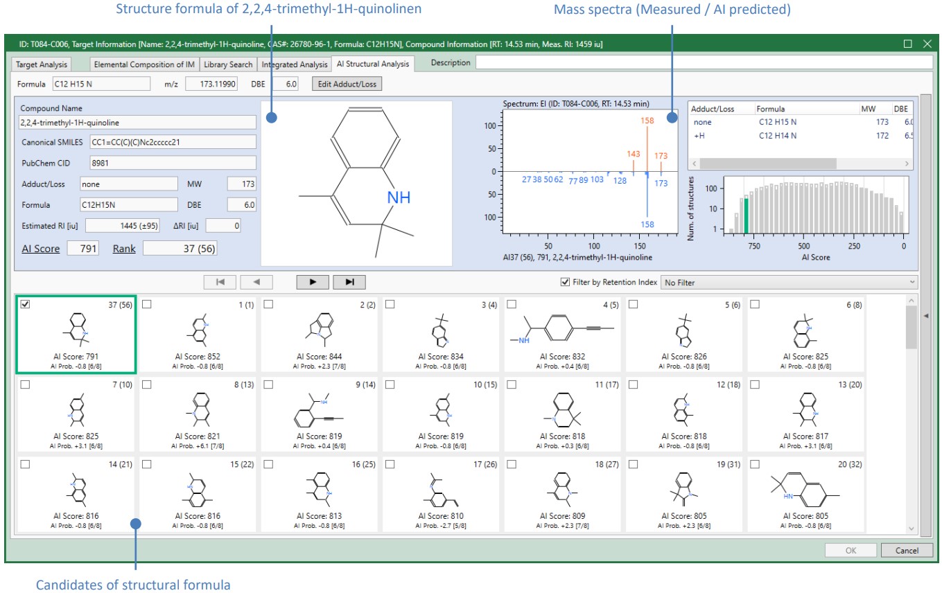 However, mass spectrum evaluation is necessary to prevent misidentification. msFineAnalysis AI can compensate this information with AI structural analysis. Figure 4 shows the AI structural analysis result window. The similarity between the measured spectrum and the spectrum predicted from the structural formula of 2,2,4-trimethyl-1H-quinolinen was high, with an AI score of 791, suggesting that it may be the target compound.