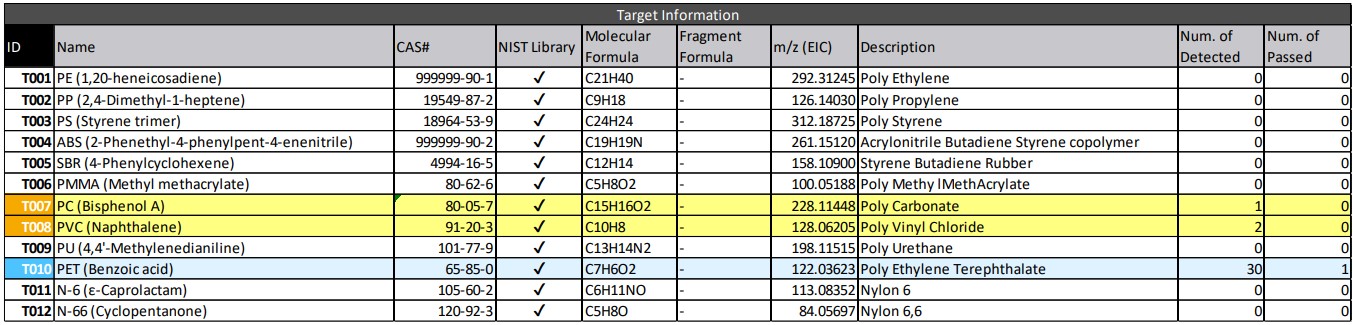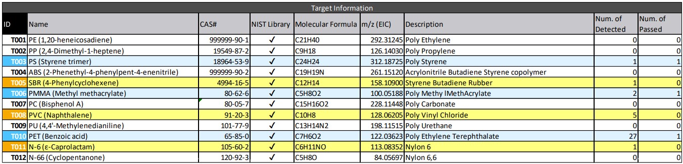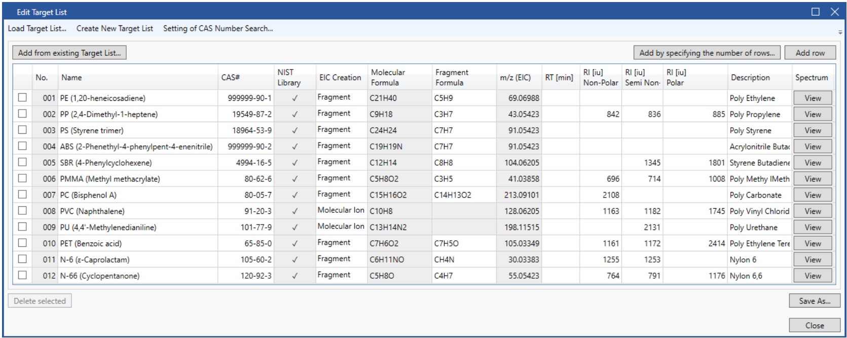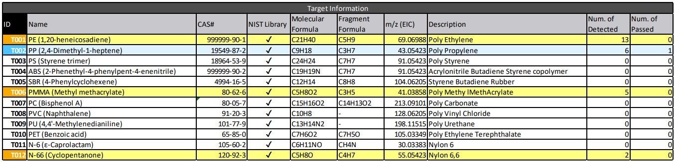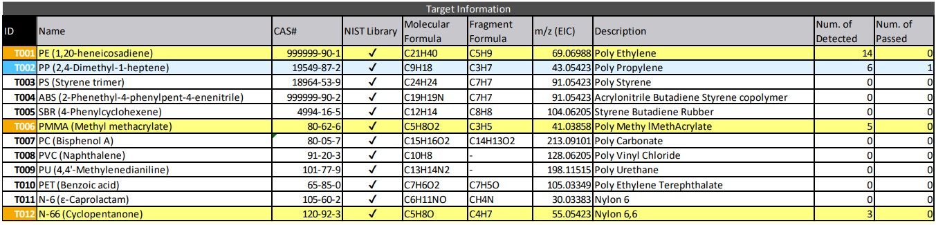 These target lists can be edited by the user, and new ones can be created for different purposes. In this MSTips we will introduce an application of polymer type estimation using the major pyrolysis products of polymers 1). Figure 1 shows a target list for this application. No. 001 1,20-heneicosadiene of polyethylene (PE) and No. 004 2-Phenethyl-4-phenylpent-4-enenitrile of acrylonitrile butadiene styrene (ABS) are not registered in the NIST library, but by registering the measurement results in advance in the NIST user library, it become possible to judge using mass spectrum similarity. Furthermore, by specifying a high-intensity fragment ion instead of a molecular ion as the extracted ion, it possible more sensitive peak detection.
