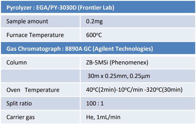 Table 5 shows the target list of the analysis results. As with PET product, benzoic acid was identified. In addition, styrene trimer of polystyrene (PS) and methyl methacrylate of polymethyl methacrylate (PMMA) were identified, suggesting that PS and PMMA may be included.