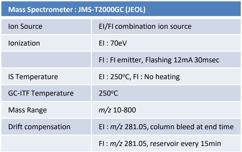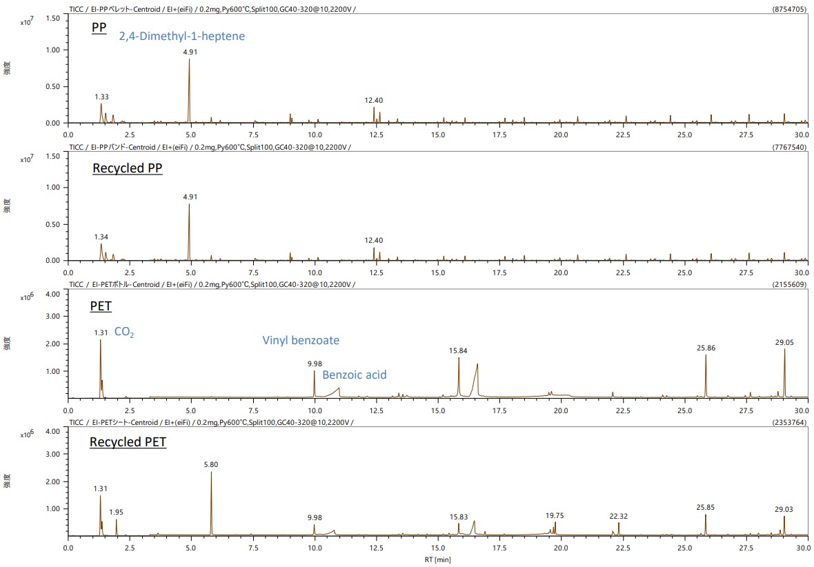 As the sample, commercially available polypropylene (PP), recycled PP, polyethylene terephthalate (PET), and recycled PET products were used. 0.2 mg of each was weighed and measured using Pyrolysis-GC-MS. EI and FI (field ionization) methods were used for ionization. The obtained data was analyzed using msFineAnalysis AI. Table 1 shows details of the measurement conditions.