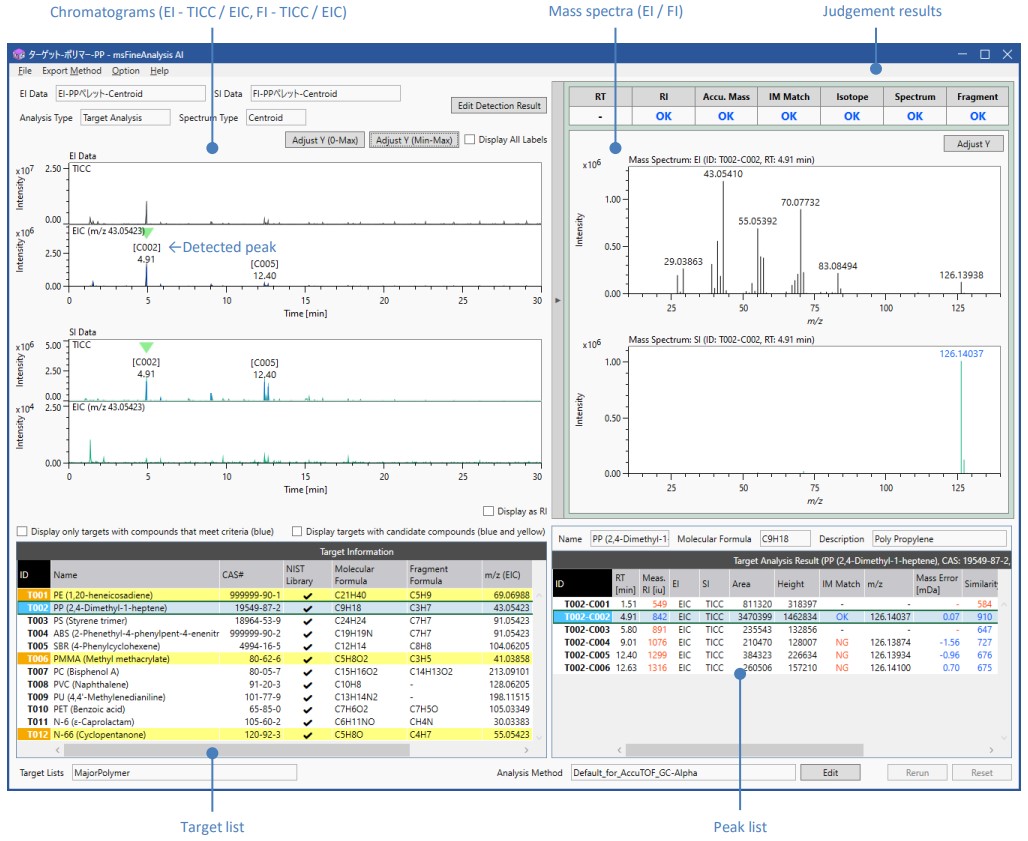 The target analysis function of the unknown compounds structure analysis software "msFineAnalysis AI" Ver.2 detects peaks from extracted ion chromatograms (EICs) based on information such as the molecular formulas and mass spectra of pre-listed components. In the previous MSTips478, we introduced an application using the software preset target list "Polymer additives".