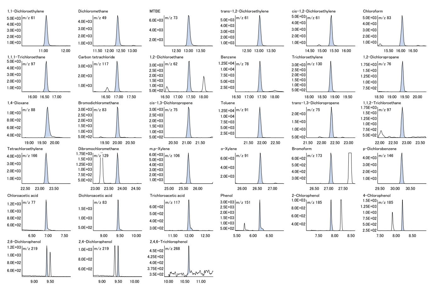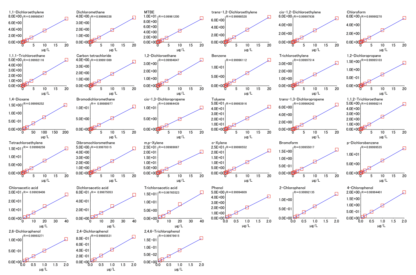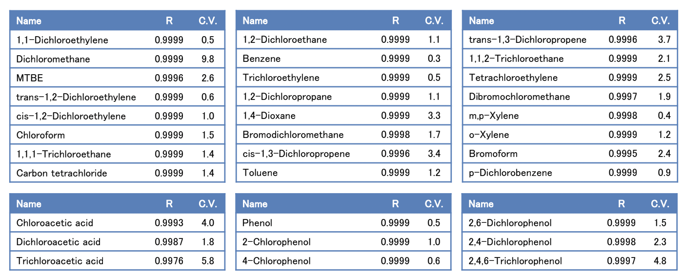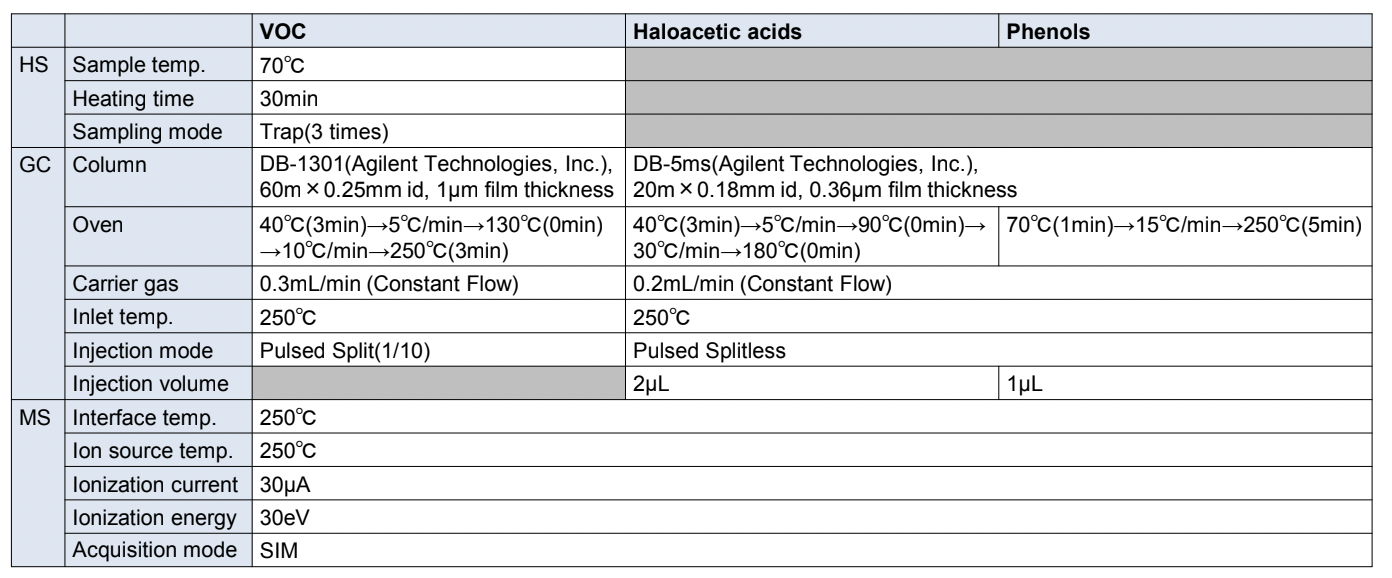 VOC: A headspace vial containing 3 g sodium chloride and 10 mL purified water was weighed and 1,4-dioxane was added to give the following concentrations: 0.1, 0.2, 0.4, 1, 2, 4, 10, 20µg/L for VOCs other than 1,4-dioxane, and 5, 10, 20, 50, 100, 200µg/L. The internal standards were added to each sample to give a concentration of 2.5 µg/L for fluorobenzene and p-bromofluorobenzene and 200 µg/L for 1,4-dioxane-d8.Haloacetic acids: For the compounds methyl chloroacetate, methyl dichloroacetate, and methyl trichloroacetate, which are the derivatives of the compounds after treatment, the concentrations of haloacetic acids in the water samples before treatment were adjusted to 2, 5, 10, 20, and 40 µg/L by stepwise dilution with MTBE. Internal standards were added to each sample to achieve a concentration of 100 µg/L of 1,2,3-trichloropropane.Phenols: Phenol, 2-chlorophenol, 4-chlorophenol, 2,4-dichlorophenol, 2,6-dichlorophenol, and 2,4,6-trichlorophenol were extracted from the water samples after dilution with ethyl acetate to obtain the following concentrations: 0.1, 0.2, 0.5, 1, and 2 µg/L. Trifluoroacetamide was added to 1 mL of the solution and the mixture was allowed to stand for 1 hour. The internal standard was acenaphthene-d10 added at a concentration of 200 µg/L.