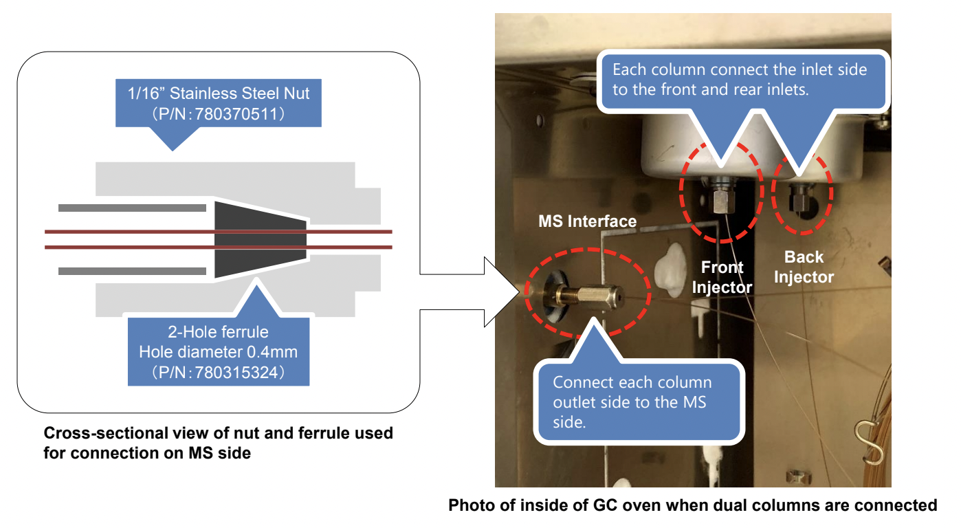 When using a dual column configuration, connect the inlet side of each column to the inlet ports at the front and back, and connect both outlet sides to the MS side. Use a two-hole ferrule that can fix two columns for the MS side connection.