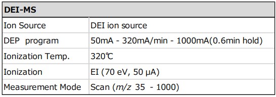 Three types of toner (cyan/magenta/yellow) for a certain copy machine were used as samples. A GC-QMS (JMS-Q1600GC UltraQuad™ SQ-Zeta, manufactured by JEOL Ltd.) was used for the measurement. No sample pretreatment was performed, and the toner was applied directly to the filament of the DEP probe and inserted into the ion source. The EI method was used for ionization. The measurement conditions for the DEI-MS measurement are shown in Table 1.
