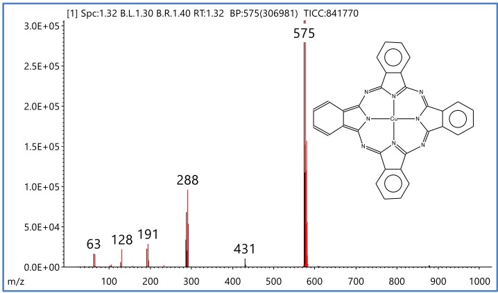 Figure 2 shows the mass spectrum of R.T. 1.32 minutes and the results of the library search using the NIST mass spectrum database. As a result, it was estimated that the organic pigment contained in the cyan toner was copper phthalocyanine.