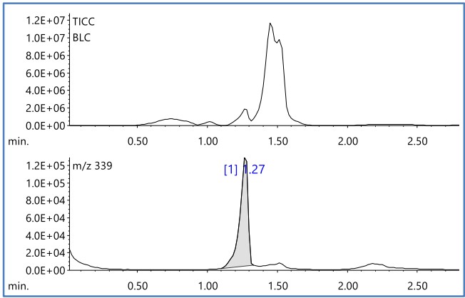 Next, Figure 3 shows the TIC Chromatogram (TICC) and the EIC of m/z 340 obtained by DEI-MS measurement of magenta. Broad peaks with peak tops around at R.T. 0.7, 1.0, 1.3, 1.4, and 1.5 minutes were detected by TICC.