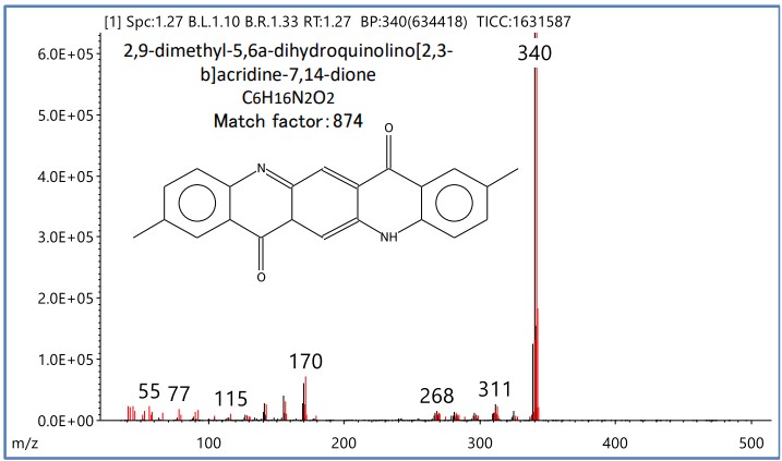 Figure 4 shows the mass spectrum of R.T. 1.27 minutes and the results of library search using the NIST mass spectrum database. As a result, it was estimated that the organic pigment contained in the magenta toner was "2,9-dimethyl-5,6a-dihydroquinolino[2,3-b]acridine-7,14-dione", that is, "Pigment Red 122"