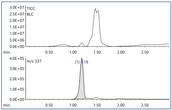 Finally, Figure 5 shows the TIC Chromatogram (TICC) and the EIC of m/z 337 obtained by DEI-MS measurement of yellow. Broad peaks with peak tops around at R.T. 0.8, 1.18, 1.4, and 1.5 minutes were detected by TICC.