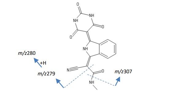 Figure 4 shows the mass spectrum of R.T. 1.18 minutes. A library search using the NIST mass spectral database did not yield any significant results. However, if the molecular ion is clearly detected as in the first two types of organic pigments, the molecular ion of this component is also estimated to be 337. Pigment Yellow 185 “2-cyano-N-methyl-2-[3-(2,4,6-trioxo-1,3-diazinan-5-ylidene)-2,3-dihydro-1H-” shown in Figure 7 isoindol-1-ylidene]acetamide” is a strong candidate.