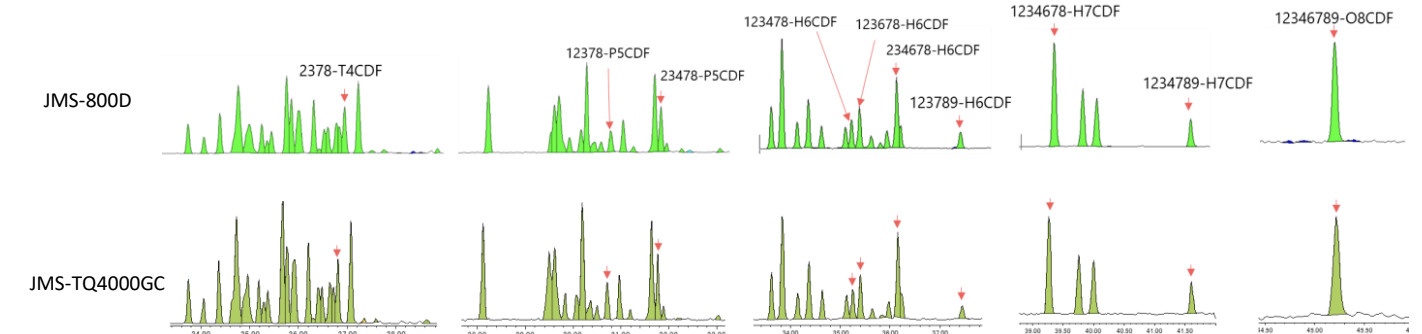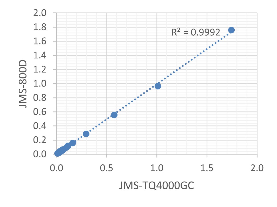 The average SRM chromatogram peaks detected by the JMS-TQ4000GC and the average selected ion monitoring (SIM) chromatogram peaks detected by the JMS-800D are shown in Figure 3. The obtained peak pattern of 4-10 chlorinated isomers of JMS-TQ4000GC was almost the same as the peak pattern of JMS-800D. Next, the quantitative values obtained by JMS-TQ4000GC and JMS-800D are shown in Table 6, and the comparison results are shown in Figure 4. The correlation coefficient R2 was 0.999, confirming that the quantitative values obtained by JMS-TQ4000GC are equivalent to those of JMS-800D.