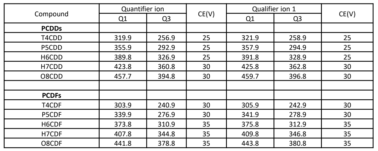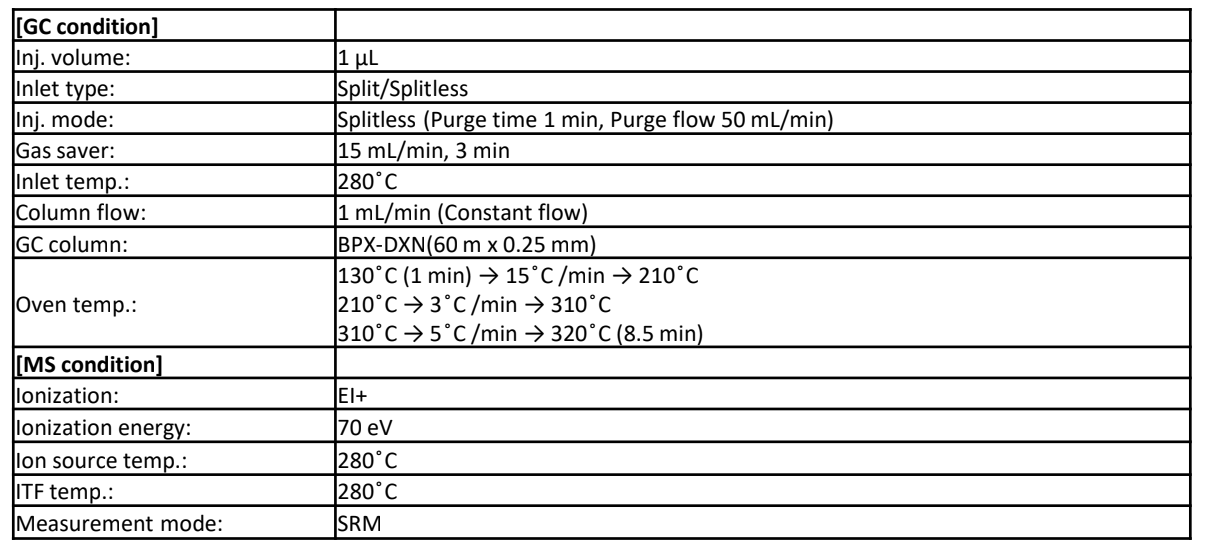 The measurement was performed using GC triple quadrupole mass spectrometer JMS-TQ4000GC UltraQuad™ TQ. The measurement condition is shown in Table 1, and the selected reaction monitoring (SRM) transitions are shown in Table 2. The Japanese industrial standards (JIS) dioxin/furan calibration solution in nonane(Cambridge Isotope Laboratories, Inc.) was used as the standard sample. The concentration range is shown in Table 3.