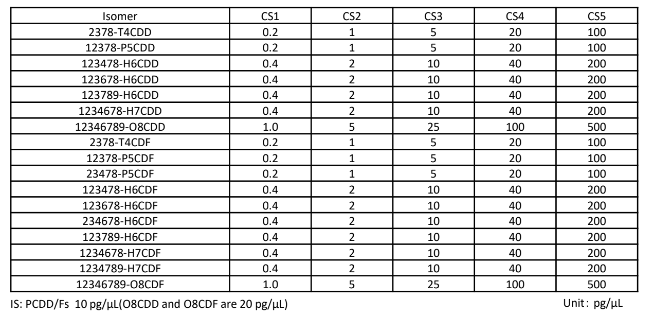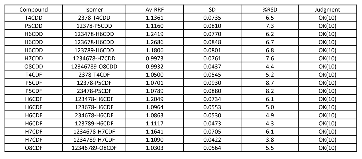 The relative standard deviation (RSD) of the average relative response factor (Av-RRF) using the measurement data of CS1-5 (CS1: 5 times, CS2-5: 3 times each repeat measurement data, 17 points in total) is shown in Table 4. The JIS for GC/HRMS requires that a total of 15 or more data points over the entire concentration range be used to construct a calibration curve, and further specifies that the RSD of the Av-RRF should be less than 10%. The RSD obtained in this measurement ranged from 3.8 to 8.7%, and it was confirmed that all isomers met the reference value (10%) of the JIS for GC/HRMS.
