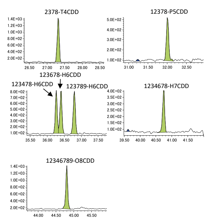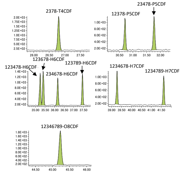 The SRM chromatogram peaks created by averaging the SRM data for the CS1 quantitation ion and reference ion are shown in Figure 2. For the average SRM chromatogram peak, all isomers, including 2378-T4CDD, which is considered to be the most toxic isomer, were observed with good peak shape.