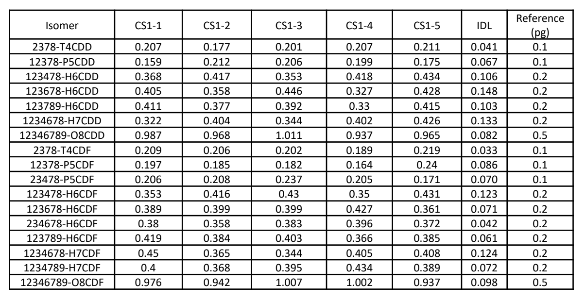 The instrument detection limit (IDL) is shown in Table 5. The JIS for GC/HRMS specifies that the IDL is calculated by tripling the standard deviation of the quantification value obtained from five replicate measurements of the lowest concentration. The IDLs obtained in this measurement ranged from 0.033 to 0.148 pg, and it was confirmed that all isomers met the reference values of the JIS for GC/HRMS.