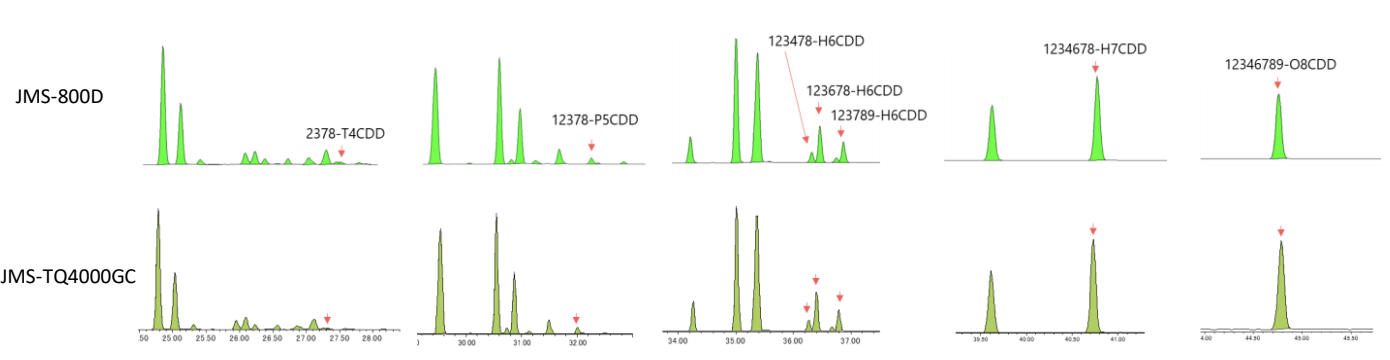 Figure 3 Comparison average SIM chromatogram peaks by JMS-800D with average SRM chromatogram peaks by JMS-TQ4000GC