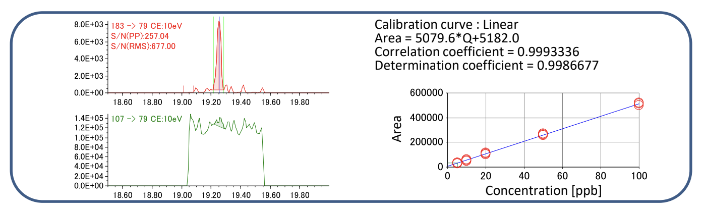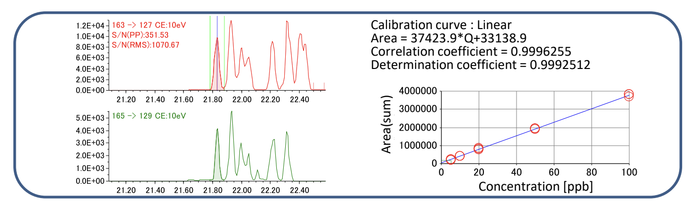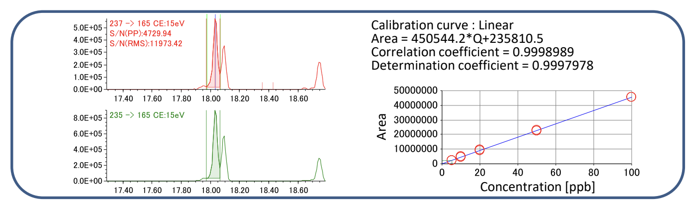 Regarding the 335 components set as measurement targets, it was determined that 328 components could be sufficiently detected at 5 ppb, with good linearity of the calibration curve. For the five components "Oryzalin, Fensulfothion, Isoxathion oxon, Imazamethabenz methyl ester, and Thiacloprid," detection at 5 ppb was possible, but improvements were determined necessary for some items such as the linearity of the calibration curve, area reproducibility, or chromatogram shape. Additionally, the two components "Chlorfenapyr and Dioxathion" were found to be difficult to detect at 5 ppb in this study. As an example of the 328 components deemed measurable, Fig. 1 to 3 show the EIC and calibration curves at 5 ppb for the three components “Captan, Cyfluthrin, and p,p’-DDD”.