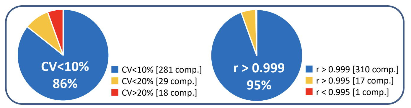 Next, Fig. 4 shows the 5 ppb area reproducibility (n=3) and the correlation coefficient of the calibration curves for all 328 measurable components. Among the 328 components, 310 components showed good reproducibility with a CV of 20% or less. Additionally, 310 components showed a correlation coefficient of r=0.999 or higher for the calibration curve, confirming no issues with linearity.
